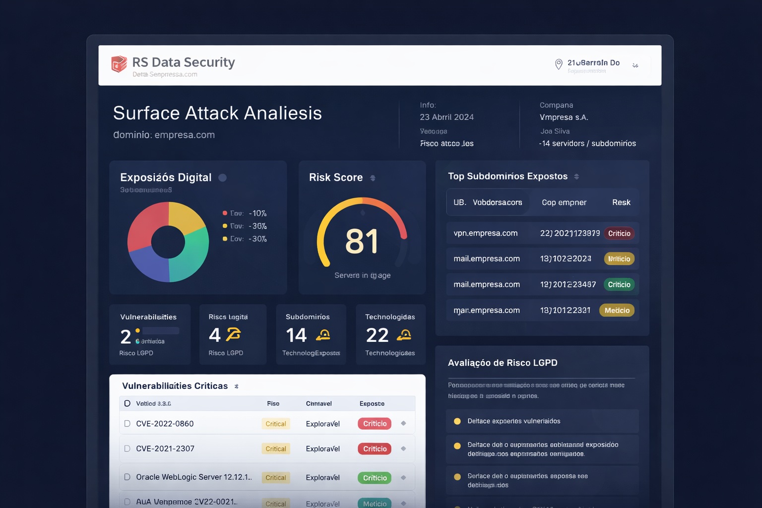 Identifique vulnerabilidades, exposição de infraestrutura e riscos LGPD em minutos.
